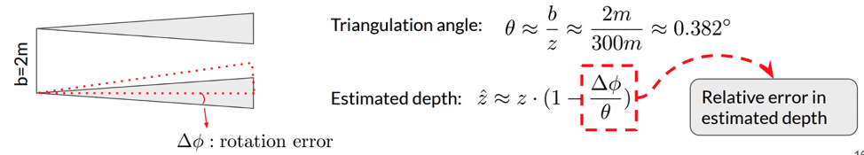 对于300米远的3D点而言,2米的baseline可谓是超级小,小到这个3D点到左、右相机中心的两条光线的夹角(triangulation angle)只有0.382度。如下图所示,极小的triangulation angle带来的后果是深度估计的精度对于相机姿态中的微小变化异常敏感:如果姿态中有0.1度的误差,那么估计的深度值的相对误差就达到了不可接受的26.2%左右,这意味着在300米深度处会产生大约78.6米的绝对误差。