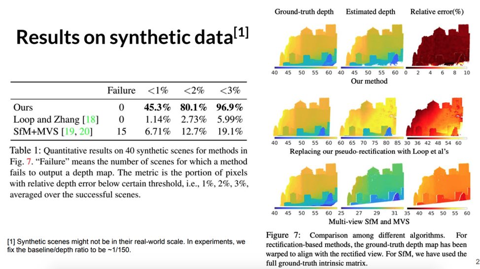 作者在仿真数据集和采集的现实数据集验证了算法。对于仿真数据集上,本文限制相机系统的baseline/depth ratio在2/300左右(对应车宽2米,物体在300米这样的现实设定),同时对相机姿态做随机的小扰动。结果显示,本文的算法估计出来的深度能够达到3%的相对误差,远超其他算法 。