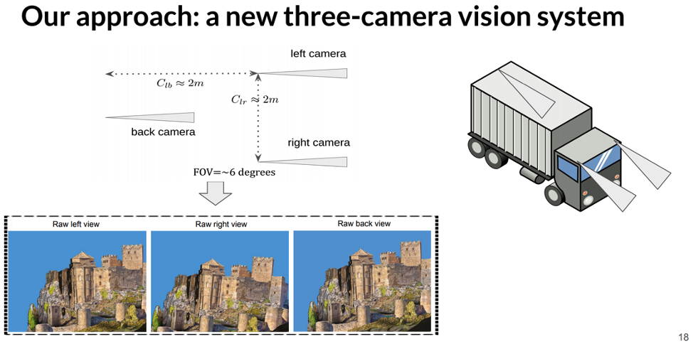 为此,作者提出了一个如下图所示的由三个长焦相机构成的新相机系统(两个放在车头,一个放在车尾),以及配套的深度估计算法。本文的解决方案绕过了对高精度相机姿态的要求,只需要知道三个相机的焦距,以及相机之间的距离。算法以三个相机同一时刻捕捉到的图片作为输入,输出left相机图片对应的深度图。整个系统流程图如下图所示。