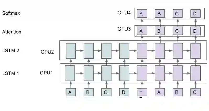 对于大型模型来说,模型并行化处理是极其重要的,因为单个模型的训练时间太长以至于我们很难对这些模型进行反复的修改。因此,在多个计算设备中处理模型并取得优秀的性能就十分重要了。如下所示,我们可以将模型分割为四部分,运行在四个 GPU 上。