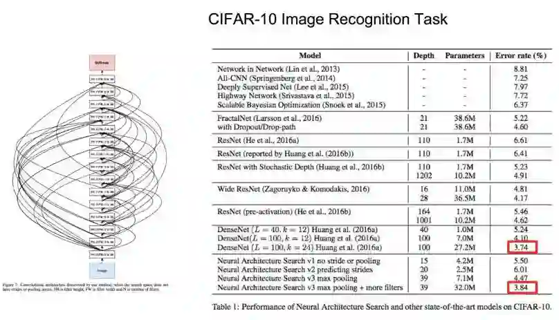 在 CIFAR-10 图像识别任务上,神经架构搜索的表现与其他顶级成果的表现对比如上图所示。