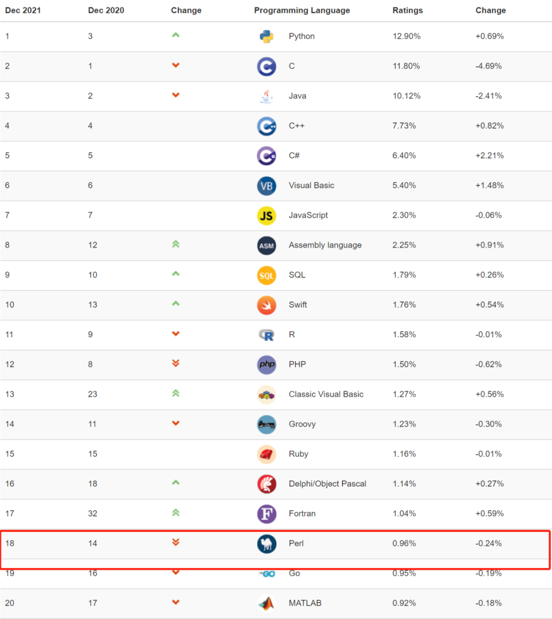TIOBE发布了今年12月的编程语言排行榜,前20名的榜单里,Perl一直处于下游阶段。相比于Python,Perl的境遇显得有些惨淡。当人们讨论“最受欢迎的编程语言”的时候,也很少有人会提到Perl。