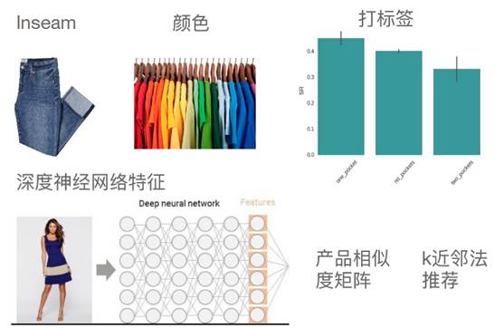 产品特征是通过深度神经网络学习得到的,通过分析图片,对每一个产品的图片放到深度神经网络中,生产一些进程,把每一件产品进程可计算产品相似度矩阵,这样就可以用邻近法进行推荐。