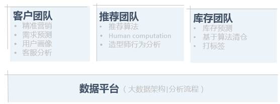 Stitch Fix 团队约 80 人左右,主要分为客户、推荐、库存和数据平台四个小团队。数据平台团队的大数据架构和自动化分析流程,支撑其他三个团队,这三个团队和事业部一一对应。