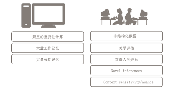 如上图,左边是计算机,右边是人,计算机可处理比较繁重的重复性计算,另外计算机的短期记忆与长期记忆都是人所不能媲美的。
