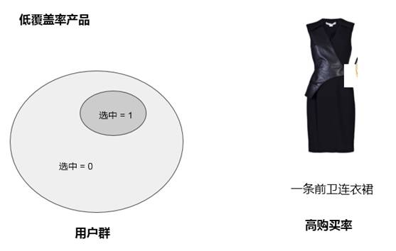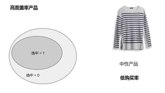 图中可以看到第一件是覆盖率比较低的,大圈是所有用户群,在所有用户群中只有很小一部分用户挑选了这个产品,因为这个产品是比较前卫的,虽受众较小,但知道应该选给谁,购买率很高。