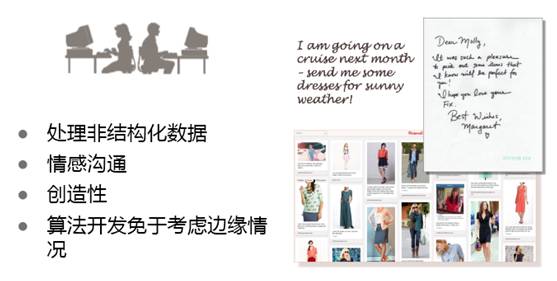 Stitch Fix 在做推荐衣服或人和货匹配时,采用的是人机协同方式,不是纯粹靠机器算法,也不是纯粹靠人工,优势互补实现 1 +1 > 2 的效果。