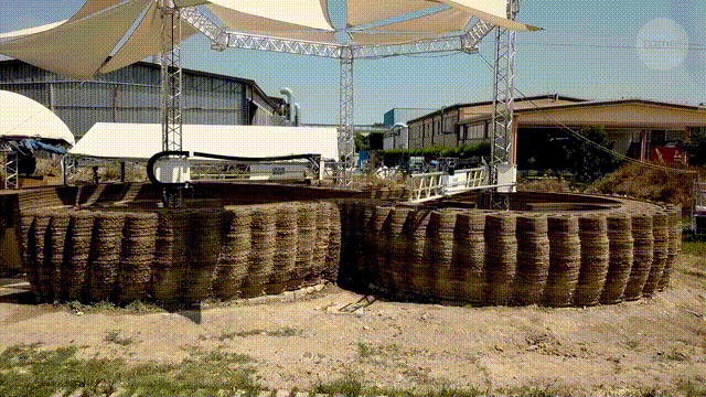 无人机舰队用聚氨酯泡沫材料去建造一个高2.05米圆柱体,有72层。另外,还用定制设计的结构胶凝材料建造了一个18cm的圆柱体,有28层。