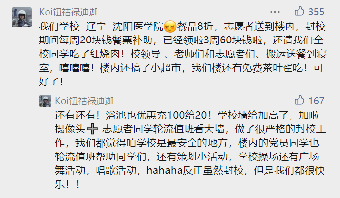 也有网友表示,学校封校时很注重学生的生活和心理健康,各种补助吃饭、策划小活动等,让大家虽然在封校,但依旧很快乐!