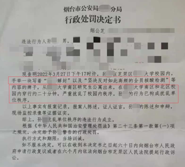 在学校的校园南区和北区穿行。公然反对和抵制校园封闭管理以及全员核酸检测,因为严重扰乱了校园管理秩序,被公安机关强制带离。