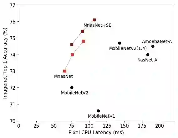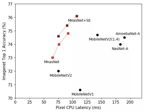 在谷歌的论文《MnasNet: Platform-Aware Neural Architecture Search for Mobile》中,他们尝试了一种基于强化学习范式的自动神经网络架构搜索方法来设计移动模型。为了应对移动设备的运行速度限制,谷歌大脑的研究人员们专门显式地把运行速度信息也加入了搜索算法的主反馈函数中,这样搜索到的模型就是一个可以在运行速度和识别准确率之间取得良好平衡的模型。通过这样的方法,MnasNet 找到的模型要比目前顶级的人工设计的模型 MobileNetV2 快 1.5 倍,比 NASNet 快 2.4 倍,同时还保持了同样的 ImageNet 首位准确率。