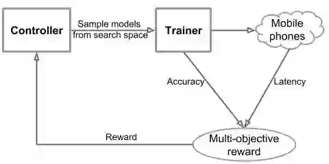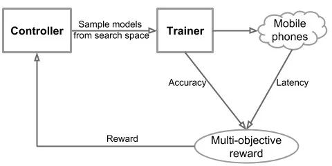 谷歌大脑方法的总体流程主要由三个部分组成:一个基于 RNN 的控制器用于学习模型架构并进行采样,一个训练器用于构建模型并训练模型得到准确率,还有一个推理引擎,它会在真实的手机上通过 TensorFlow Lite 运行模型、测量模型的运行速度。他们把这个任务公式化为一个多目标优化问题,优化过程中得以兼顾高准确率和高运行速度;其中使用的强化学习算法带有一个自定义的反馈函数,可以在不断的探索中找到帕累托最优的解决方案(比如,不断提升模型的准确率,同时并不会让运行速度降低)。