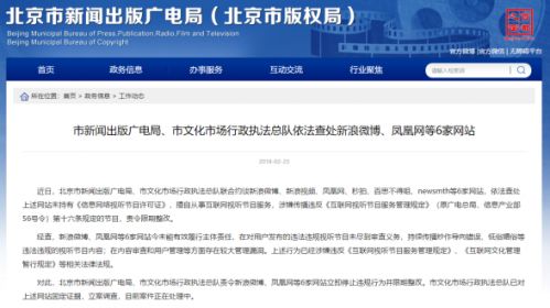 近日,北京市新闻出版广电局约谈了新浪微博、新浪视频、凤凰网、秒拍、百思不得姐、水木社区等 6 家网站,对未持有《信息网络视听节目许可证》,擅自从事互联网视听节目服务,涉嫌传播违反《互联网视听节目服务管理规定》第十六条规定的节目依法责令其限期整改。