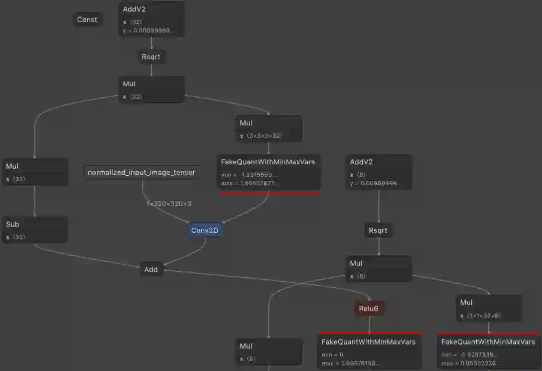 此外,对于 EdgeTPU 和 DSP 变体,也有一些要注意的地方。这些变体有两种精度格式:uint8 和 float32。精度为 uint8 的模型在训练时使用的是训练时量化 (QAT) 方法,而 float32 模型在训练时则未使用此方法。在 QAT 过程中,伪量化节点会插入到模型的计算图中。因此,正如我们马上将看到的那样,在 TFLite 转换过程中我们通常需要格外注意使用 QAT 训练的模型。