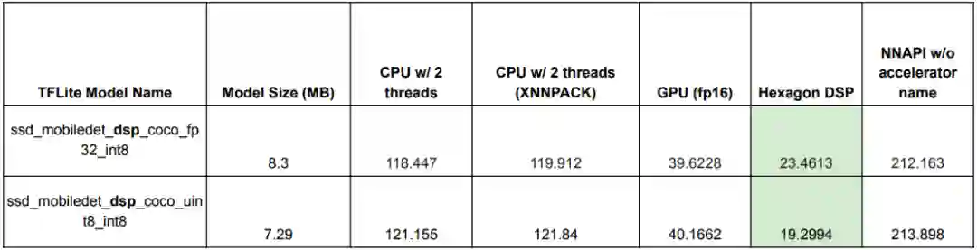 对于 EdgeTPU 和 DSP 变体,这里有一点需要特别注意,由于它们专门针对不同的硬件加速器优化,因此在 Colab 上它们转换后的对应模型会慢得多。