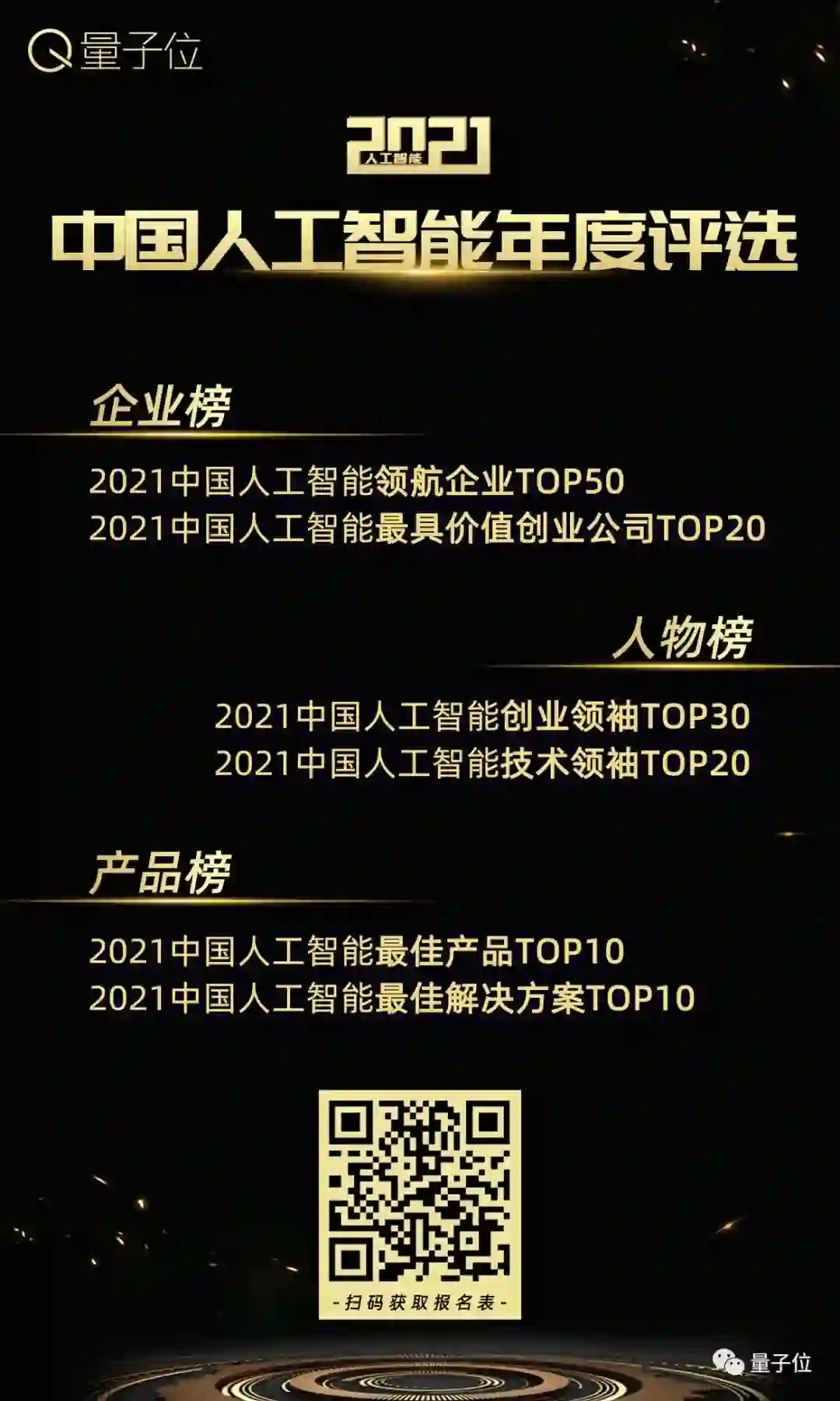 「2021中国人工智能年度评选」报名中!本次评选将从公司、人物、产品三大维度寻找优秀的AI企业,欢迎大家扫码报名参与。评选将于12月揭晓,期待与百万从业者们,共同见证这些优秀企业的荣誉!