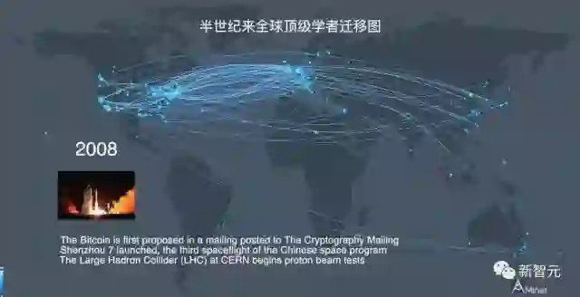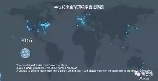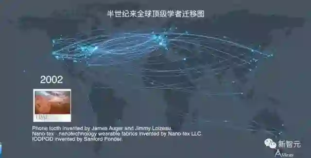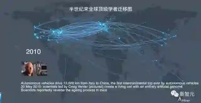 从MS-DOS发明、第一个个人数字助理,到第一台iPhone,用基因方法修改人类胚胎,伴随人才的流动,展现科技发展图景。从图中可以清晰的看到在过去50年,人才从欧洲到美国、从美国东海岸到西海岸、从美国到中国的流动,以及更加全球化的变化。