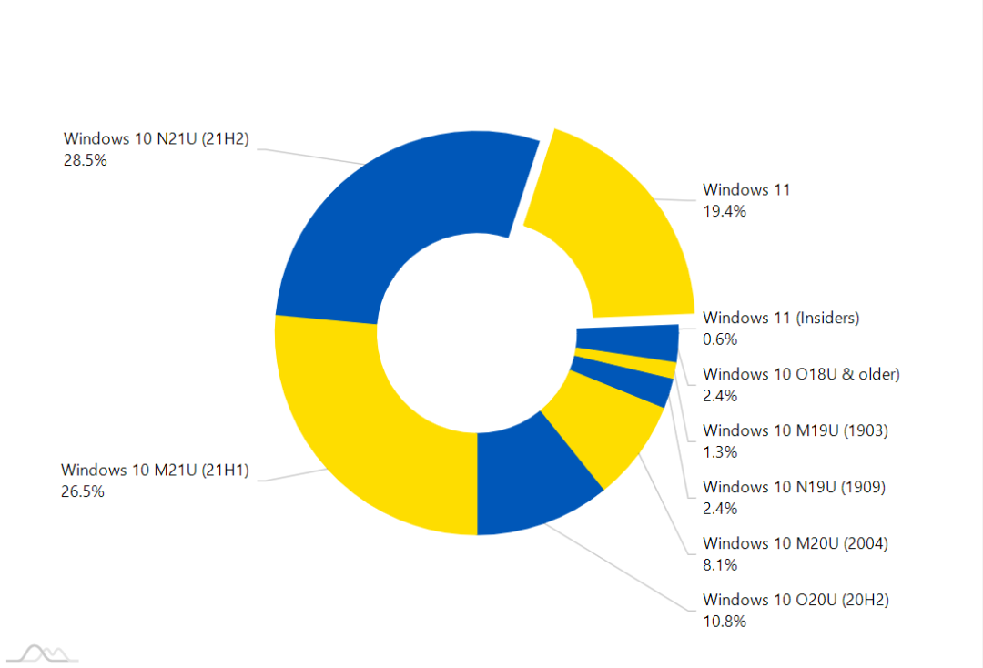 与 Windows 11 的细微增长不同,Windows 10 (21H2)占比继续轻松领先 ,从 2 月份的 21% 增加到 3 月份的 28.5%;此外,Windows 10(21H1)也占有 26.5% 之多,去年发布的这两个 Windows 10 版本共占据了一半以上份额。