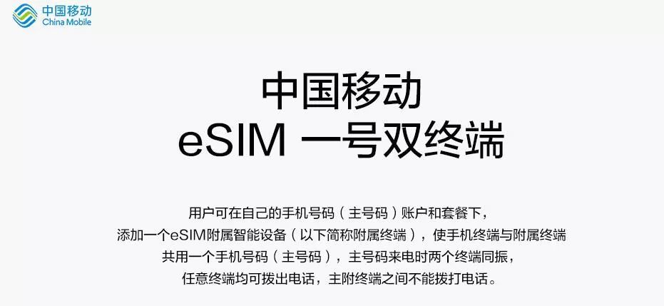 而该服务具体能实现什么目的,根据移动官方的介绍我们可以看到,用户可在自己的手机号码(主号码)账户和套餐下,添加一个eSIM辅助智能设备,使手机终端与附属终端共用一个手机号码(主号码),主号码来电时两个终端同振,任意终端均可拨出电话,主附终端之间不能拨打电话。