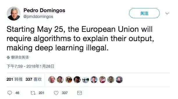 “从 25 日起,欧盟将要求算法解释输出的原理,届时深度学习将变得非法。”