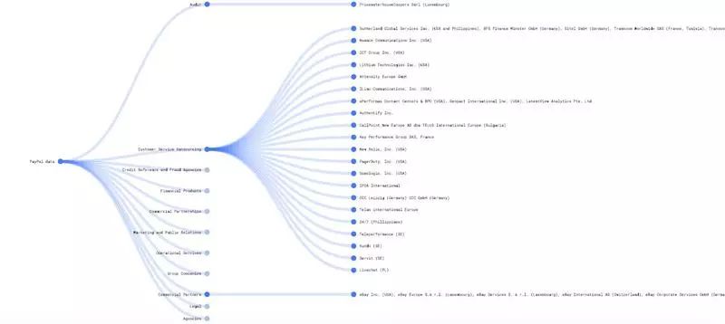 想了解 PayPal 如何使用用户数据、分享给哪些第三方,可以点击下面的链接查看数据可视化效果: