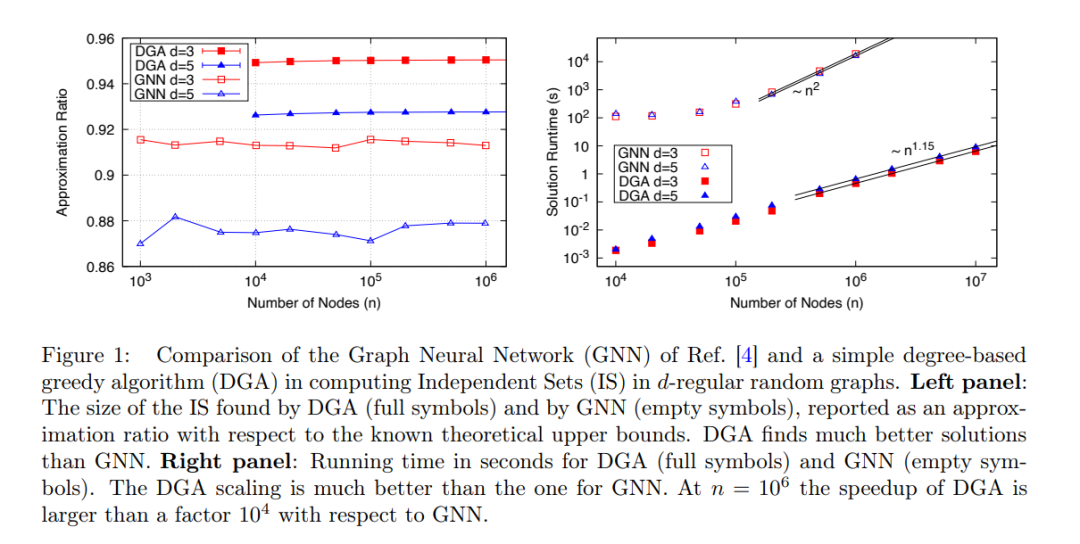 Martin JA Schuetz 等人提出的新型 GNN 可以为非常大的图(n≤ 10^6)找到 IS:算法运行时间与问题大小成比例:t∼ n^1.7,并且算法性能随着 n 的增加保持稳定,如下图 1 所示。