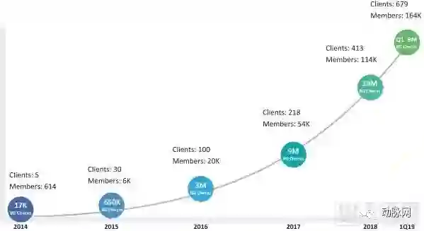 这点也可以从Livongo的用户数和客户规模中得到体现,单纯从会员规模来说,2016年之前,发展较为缓慢。2016年4月完成4450万美元C轮融资,其中关键一步是General Catalyst、KPCB、DFJ Venture之外,引入马萨诸塞州蓝十字蓝盾、默克全球健康创新基金等拥有深厚医疗背景的产业资本,在大客户拓展上利好,会员数直接从2016年的2万增长为2018年的11.4万,企业客户数量从2016年的100增加到2018年的413,而且2019年第一季度的会员数量达到16.4万人,依然处于快速增长阶段。