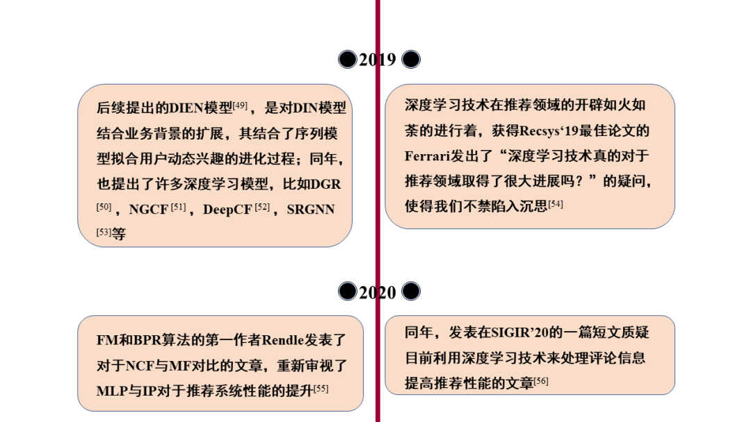 4. 整理此文的目的是给大家一个清晰的脉络,可当作一篇小小综述。从信息过载概念的提出到推荐系统的起源,从前深度学习时代的推荐系统到劲头正热的深度推荐系统,再到最后对于深度学习技术带来的推荐系统性能提升的质疑,每个阶段都是必不可少的。