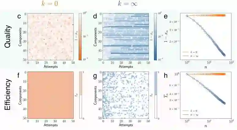 同时,研究者也评估了两件指标,每次尝试的质量和效率。在 k=0 这样的运气模型中,反复尝试并不能带来总体质量和效率上的提高改进(图 c、f),最后的成功与否完全取决于撞大运。而在另一个模型中(图 d、g),因为有经验的积累,我们明显能够看到质量(评价分数 x,图中以 1-x 减小表示质量增高)与效率(T)的改进。