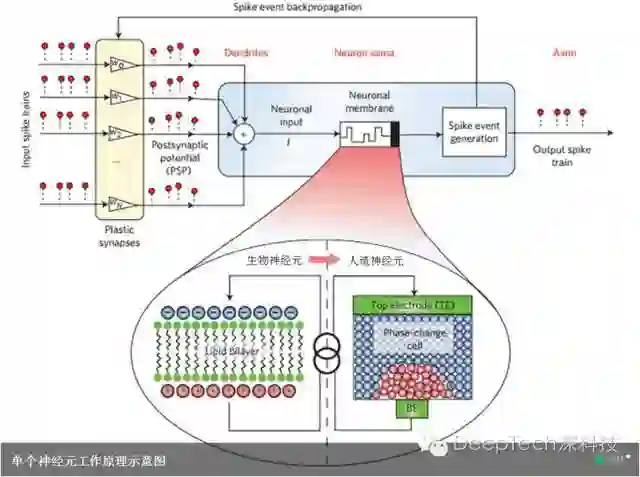 先回顾一下 IBM 于 2016 年 8 月发布的人造神经元。这种相变神经元由输入端(类似生物神经元的树突)、神经薄膜(类似生物神经元的双分子层)、信号发生器(类似生物神经元的神经细胞主体)和输出端(类似生物神经元的轴突)组成。信号发生器和输入端之间还有反馈回路以增强某些类型的输入信号。
