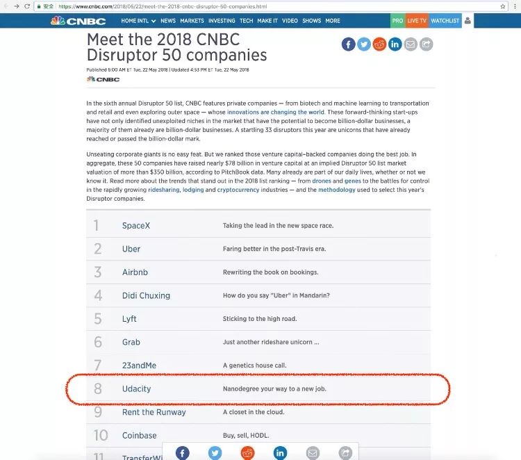 上个月(2018年5月22日)CNBC 发布了2018年 “全球50大颠覆公司”(CNBC Disrupter 50)榜单,硅谷科技教育平台 Udacity 连续 3 年登榜,位列第 8。同时上榜的 Udacity 合作伙伴还有 Lyft,Airbnb,滴滴出行和 Github。