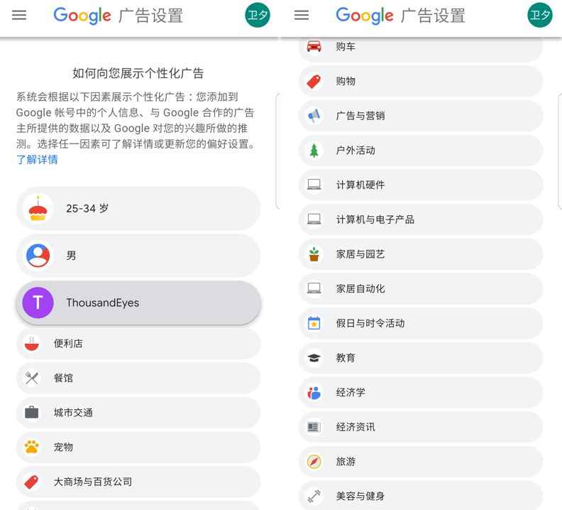 同时,谷歌也尽可能做到了数据透明,下图是我在YouTube看 广告的时候,谷歌在广告设置展示的我的标签。