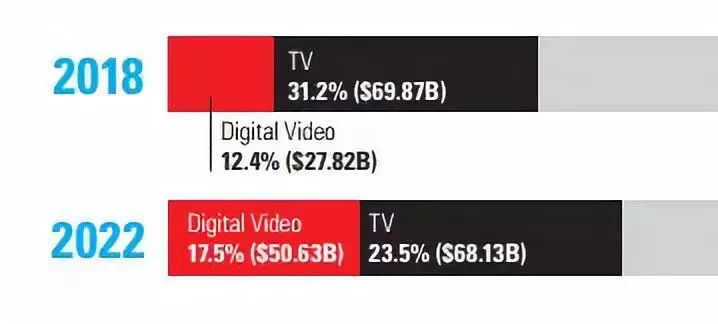 在2018年,视频广告在整体中占比为12.4%,到2022视频广告上升到了17.5%,金额也从278.2亿美元上升到了506.3亿美元,而与之对比,电视广告的份额从31.2%下降到23.5%,收入绝对值也在下降。