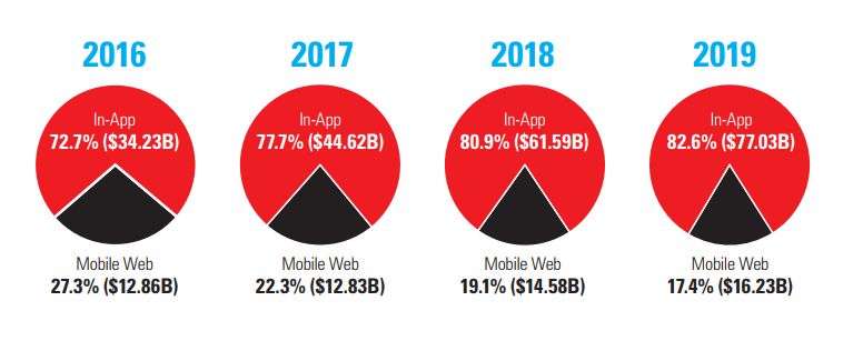 接下来看另一个重要趋势——在线广告在APP里市场份额和Web端相比在不断上升。这背后的原因是在目前的移动生态下,原生应用的确比移动浏览器能提供更好的用户体验。