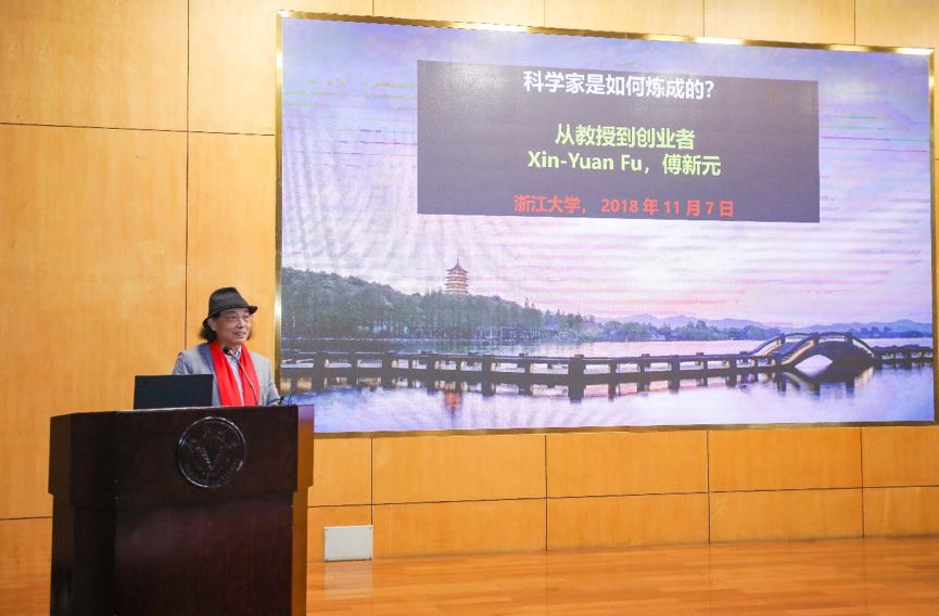 在特邀发言环节,傅新元教授首先讲到了什么是创新性发现,然后介绍了自己的科研经历。傅新元从CUSBEA项目到哥伦比亚大学,再到洛克菲勒大学、耶鲁大学、新加坡国立大学,最后又回到国内。他最近走上创业之路,通过自己的原创性发现——JAK-STAT通路,来寻找源头创新药。他认为,虽然国内近年来CNS论文发了很多,但是做出了groundbreaking的(开创性)研究,开辟一个领域的突破性成果几乎没有。他也勉励在座的学生,不要拘泥于发表高水平论文,而是要勇于做出原创性发现。
