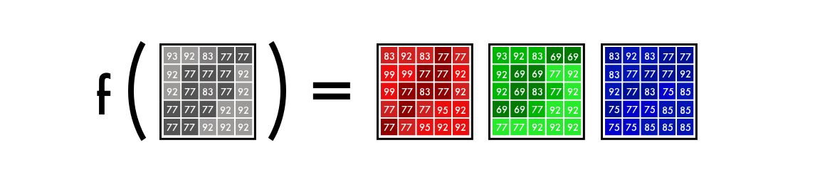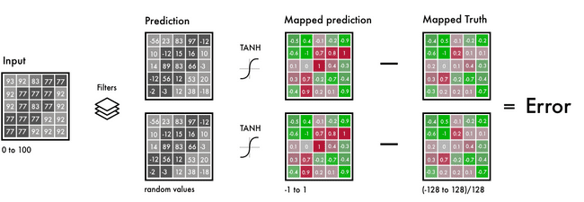 简单来说,输入就是以网格表示的黑白图像,输出是两个具有颜色值的网格。在输入和输出之间用滤波器将它们连接起来。这是一个卷积神经网络。