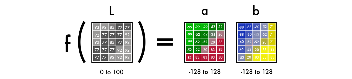 真实的颜色值分布在-128 到 128 的区间内。这是 Lab 色彩空间的默认区间。用 128 除这些值就能获得-1 到 1 的区间分布。这种「标准化」操作使我们能比较预测的误差。