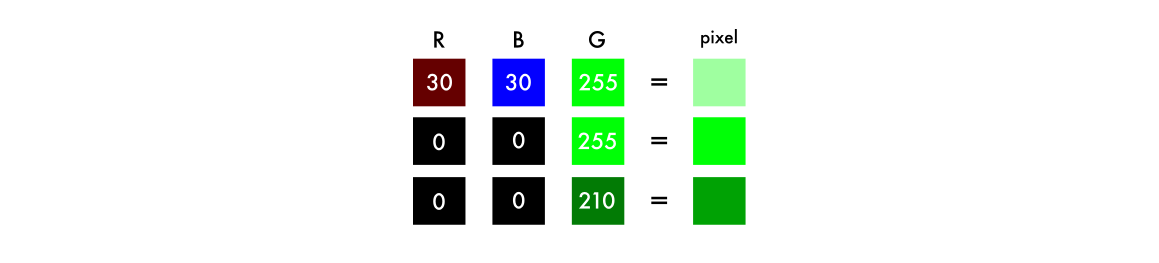 为了实现白色,你需要让三种颜色的分布平均,通过为红色和蓝色加入相同数值——结果就是绿色变得更亮了。所以,彩色图像使用三个通道的数值对比对颜色进行编码。