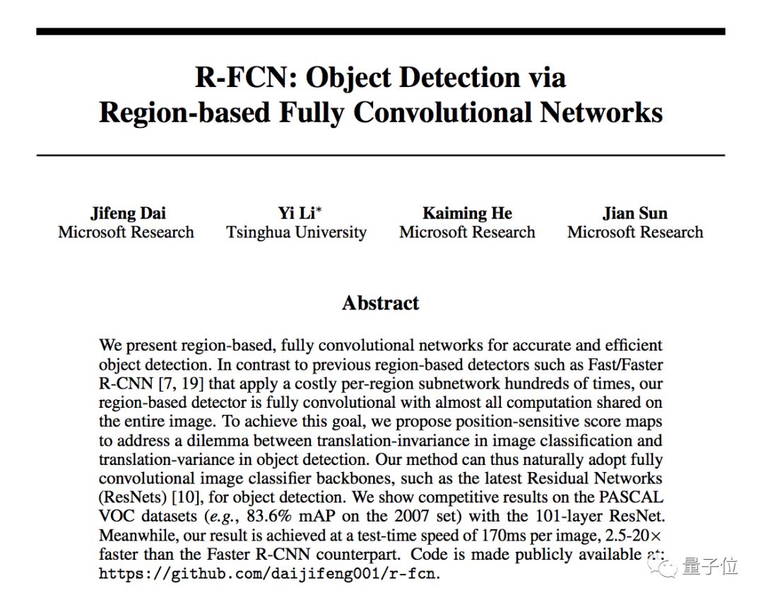 代季峰的一大代表作,是他在2016年发表在NIPS上的R-FCN,引用数超过1600,在GitHub上也有超过1100颗星。