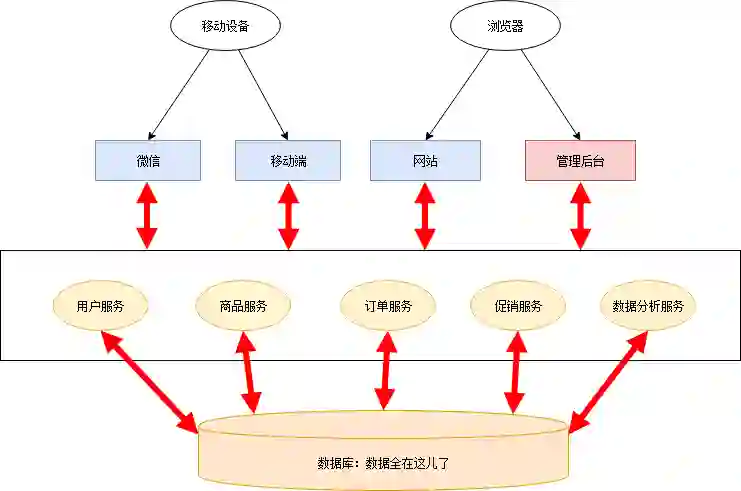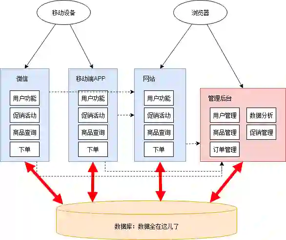 因为开发任务比较紧迫,小明小红没有好好规划整个系统的架构,随便拍了拍脑袋,决定把促销管理和数据分析放在管理后台里,微信和移动端APP另外搭建。通宵了几天后,新功能和新应用基本完工。这时架构图如下: