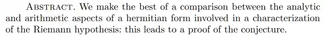 Andre Unterberger 对黎曼猜想涉及到的厄米特形式(hermitian form)的分析和算术部分进行了详尽的比较,从而证明了该猜想。