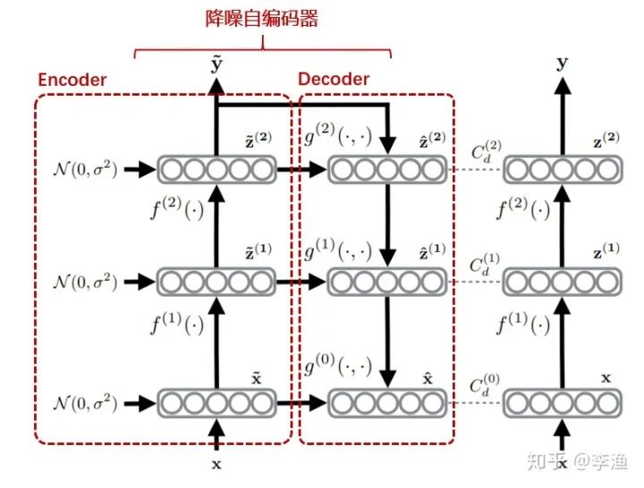 整个网络由两个部分构成,分别是降噪自编码器(Encoder+Decoder)以及无噪的前向网络(网络结构一般与 Encoder 部分一致)。此处不对网络细节做详细介绍,主要给出其中的核心思想: