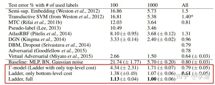 上图给出了该模型在 MNIST 数据集的实验结果。从图中可知,无论是在全数据集下,还是在 100 条的极少数据集下,本研究所提出的模型与一众其他模型相比,表现都是最优的。其中也包括2.1中提到的 Pseudo-Label 模型。尤其值得一提的是,Ladder 仅仅采用了不到 1% 的有标签数据就实现了 1% 的错误率,比完整数据集相比,仅低了 0.5%。