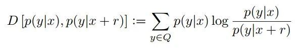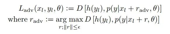 其中,r_adv 代表对输入数据所施加的对抗噪声,而 D 则是 模型对于施加噪声前后两个输入对应输出的非负度量。在 Temporal ensembling Model 中,此项为 MSE,而此处的 VAT 则采用了 KL 散度,即:
