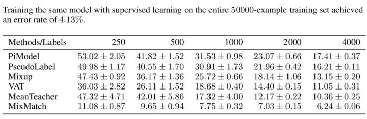 上图是 CIFAR-10 数据集上的实验结果。从图中可以看出,MixMatch 技术显著优于先前的半监督技术,尤其有标签数据量少的情况下,MixMatch 的优势尤其明显。例如在仅有 250 条有标签数据下,MixMatch 的表现相对于第二名高了近 25 个百分点。