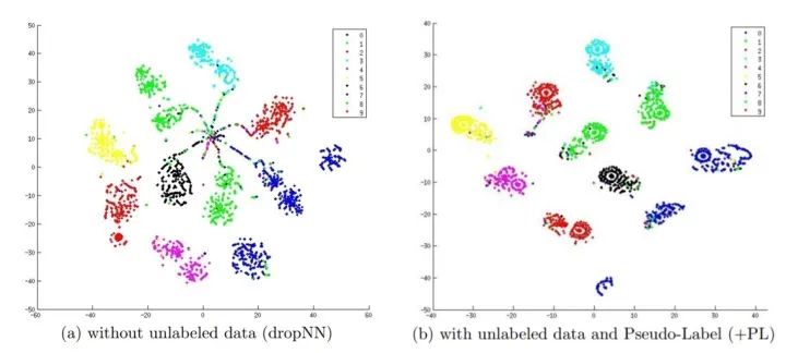 进一步,研究人员通过降维可视化的方式展示了 Pseudo-Label 模型使用前后的效果,实验数据包含 600 有标签数据 + 60000 无标签数据: