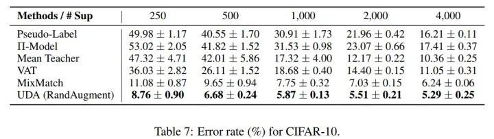 为了和前面的技术做对比,这里展示了 UDA 在 CIFAR-10 上的实验结果。从表中可知,UDA 在 MixMatch 的基础上又往前走了一步。尤其在少标签数据的情况下, UDA 技术相对于其他技术具有不可比拟的优势。
