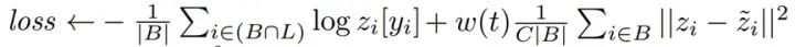 其中,第一项为交叉熵,用于计算有标签数据的误差;第二项为 MSE,用来计算无标签数据与伪标签之间的均方误差,对应前面提到的 Consistency Regulation。