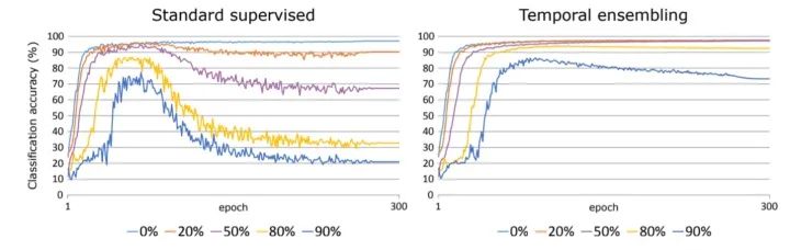 右边则展示了 temporal ensembling 的表现。这一模型对抗标签的错误标注是惊人的。从图中可以看出来,即使有一半标签是错误的情况下,模型最终的表现也与无错误的情况一致。即使在 80% 标注错误的情况下,其模型的错误率也下降不到 10%。