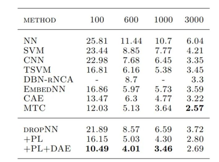 在实验中,研究人员用 MNIST 数据集进行了实验验证,并尝试了在有标签数据仅为100、600、1000和3000时的情况: